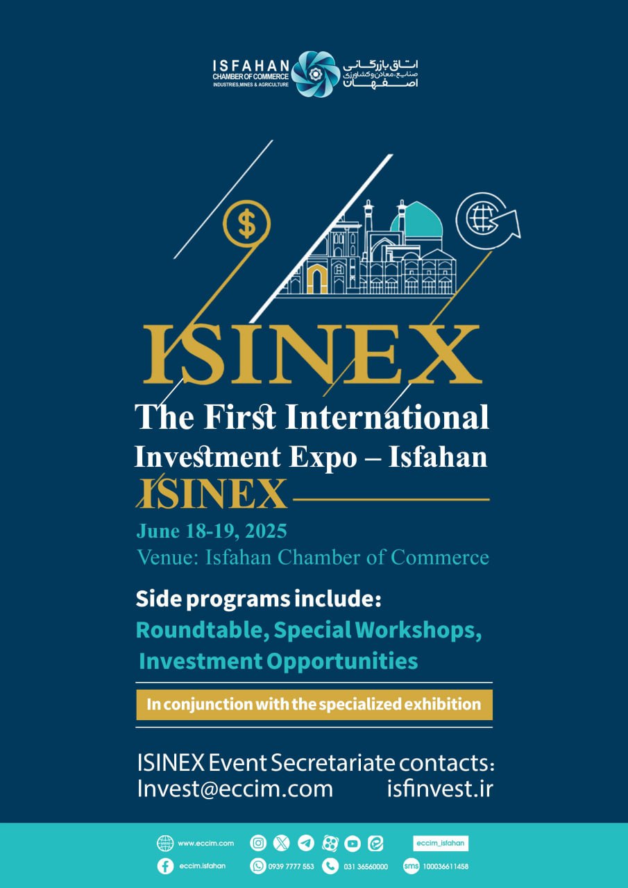 Invitation Participez à la première Exposition Internationale d'Investissement d'Ispahan (ISINEX), du 18 au 19 juin 2025. Une opportunité unique de découvrir et présenter des projets, réunissant acteurs économiques et investisseurs pour un développement économique idéal.