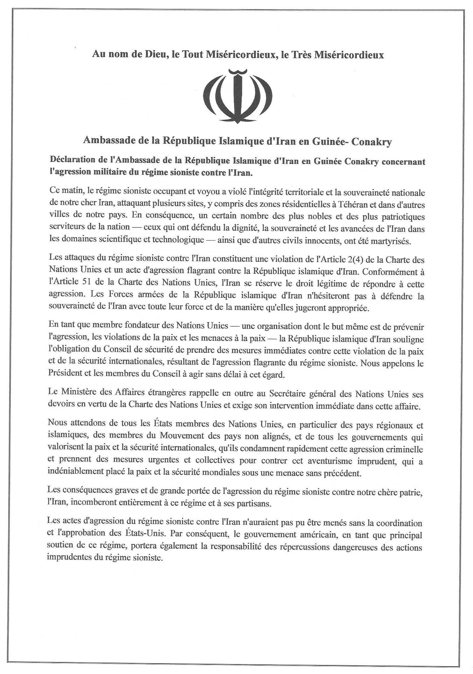 Déclaration de l'Ambassade de la République Islamique d'Iran en Guinée Conakry concernant l'agression militaire du régime sioniste contre l'Iran